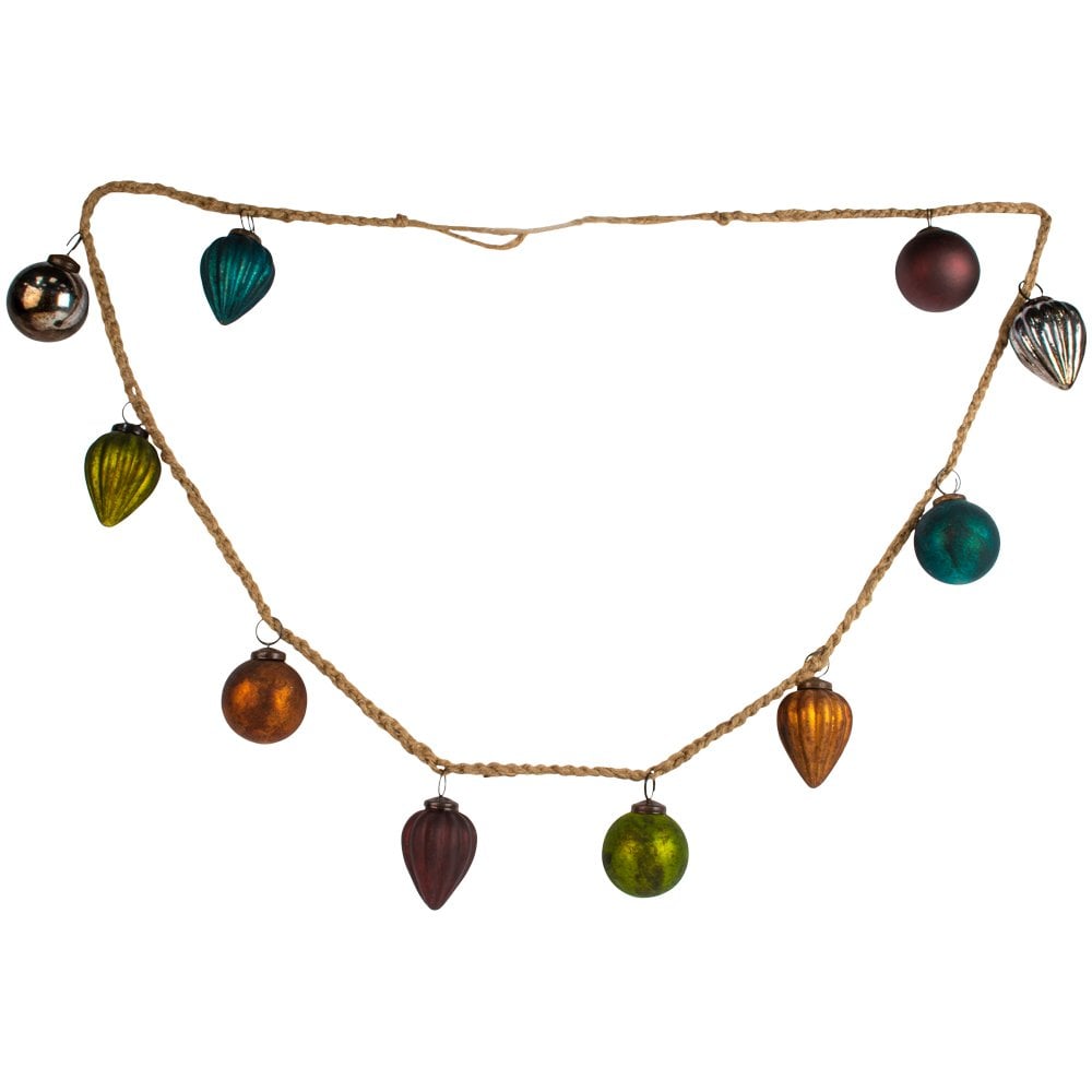 Each garland features a collection of colourful ribbed and round baubles, beautifully arranged along a plaited jute rope. The natural rope contrasts perfectly with the vibrant metallic baubles, creating a classic yet playful look that suits both traditional and contemporary interiors.