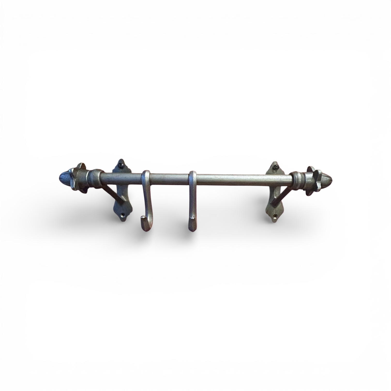 This cast antique iron hook rail combines decorative detail with everyday practicality. Crafted from solid cast iron, it features two elegant finial ends and a sturdy central rail, giving it a traditional, slightly rustic character.