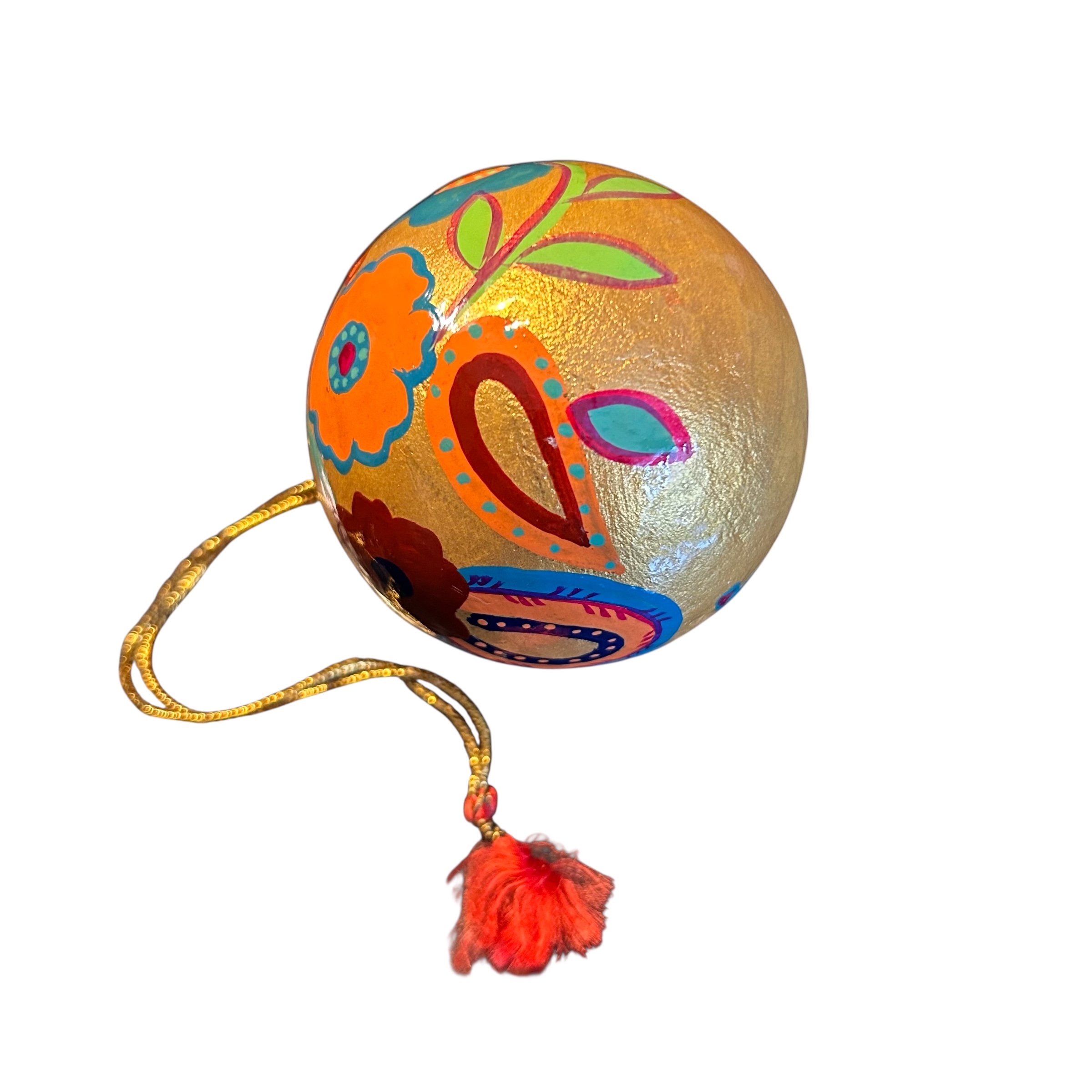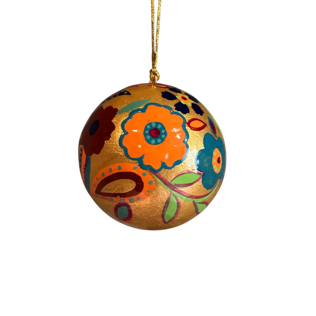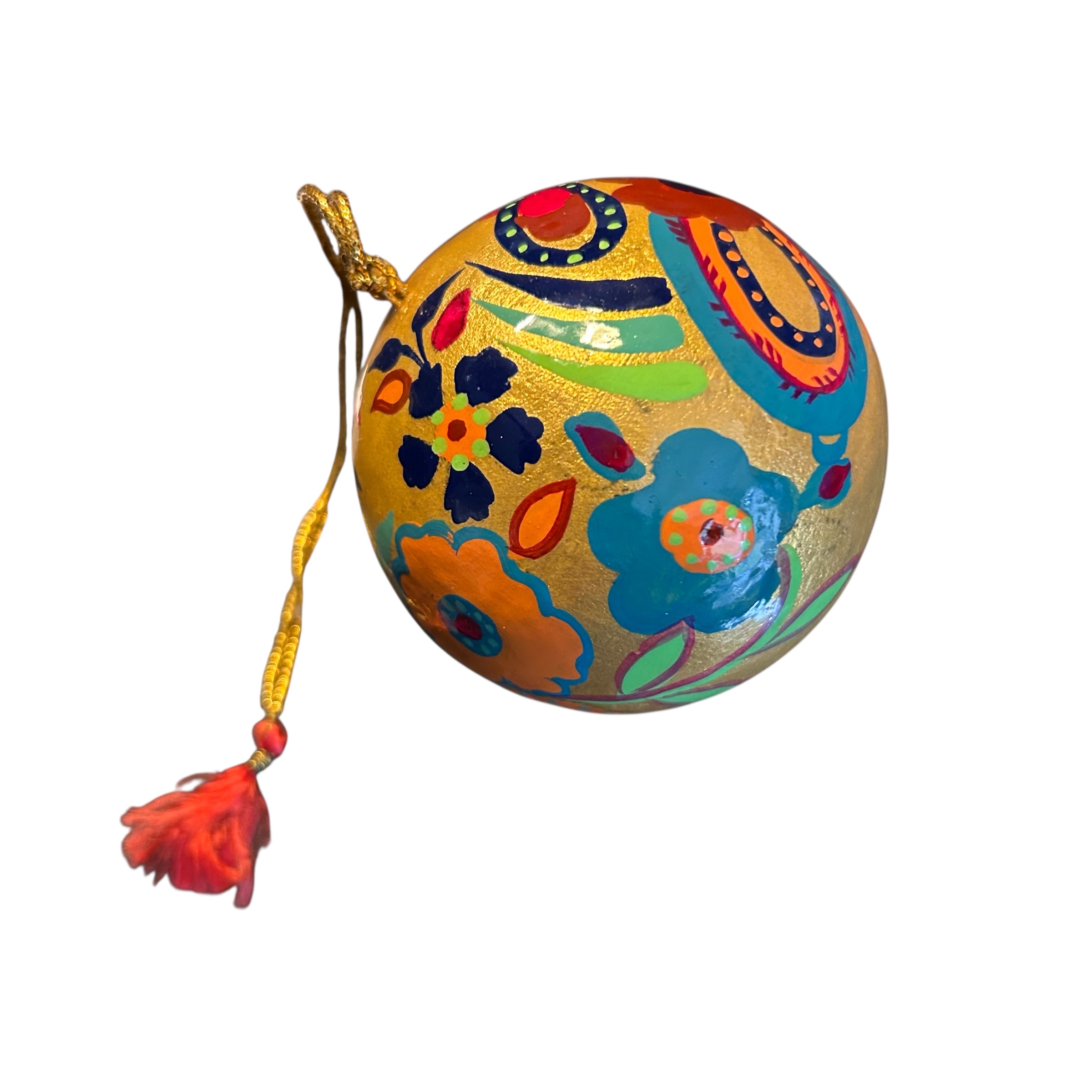 - Design: Gold papier mâché bauble with multicoloured floral and paisley motifs