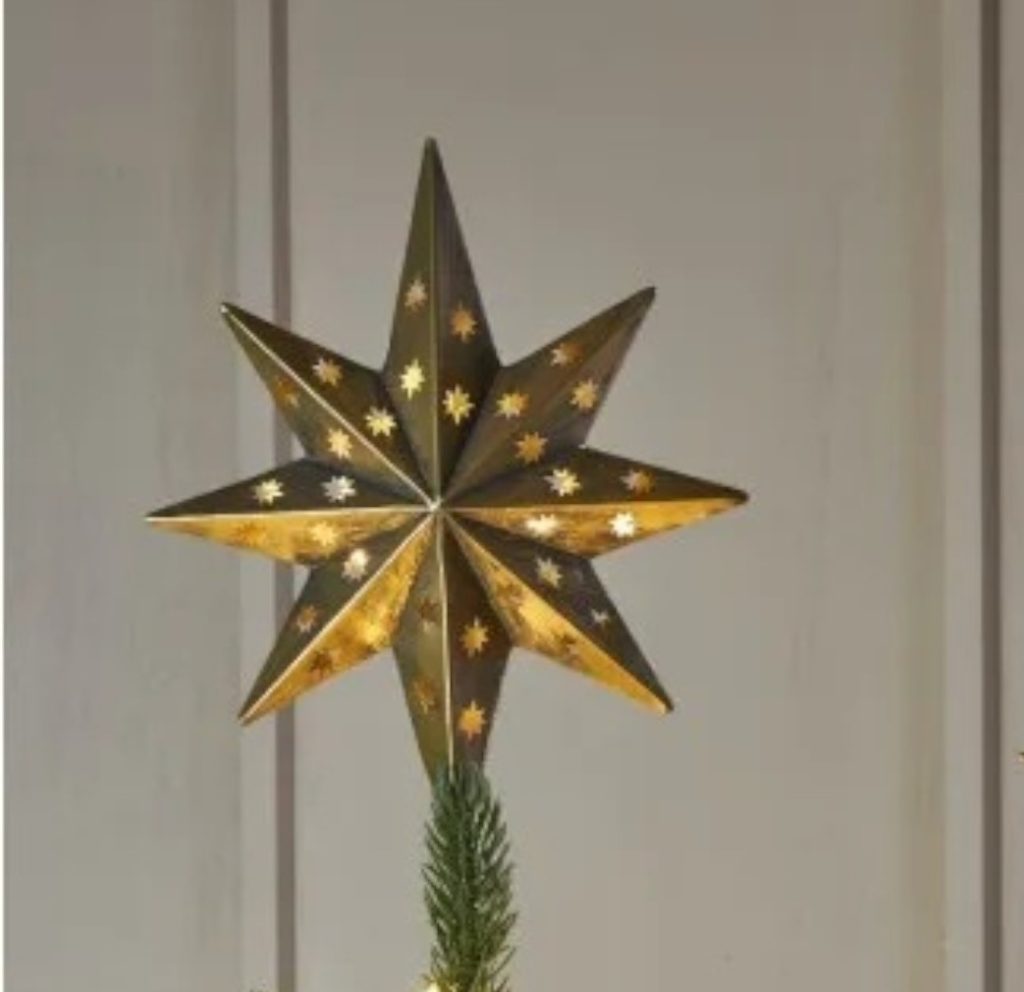 The star’s 10 warm white LEDs glow softly through the intricate perforated metal, casting a beautiful patterned light. Its distressed gold surface adds vintage appeal, blending perfectly with both modern and traditional interiors. Use it as a hanging decoration or a treetop ornament to elevate your festive styling.