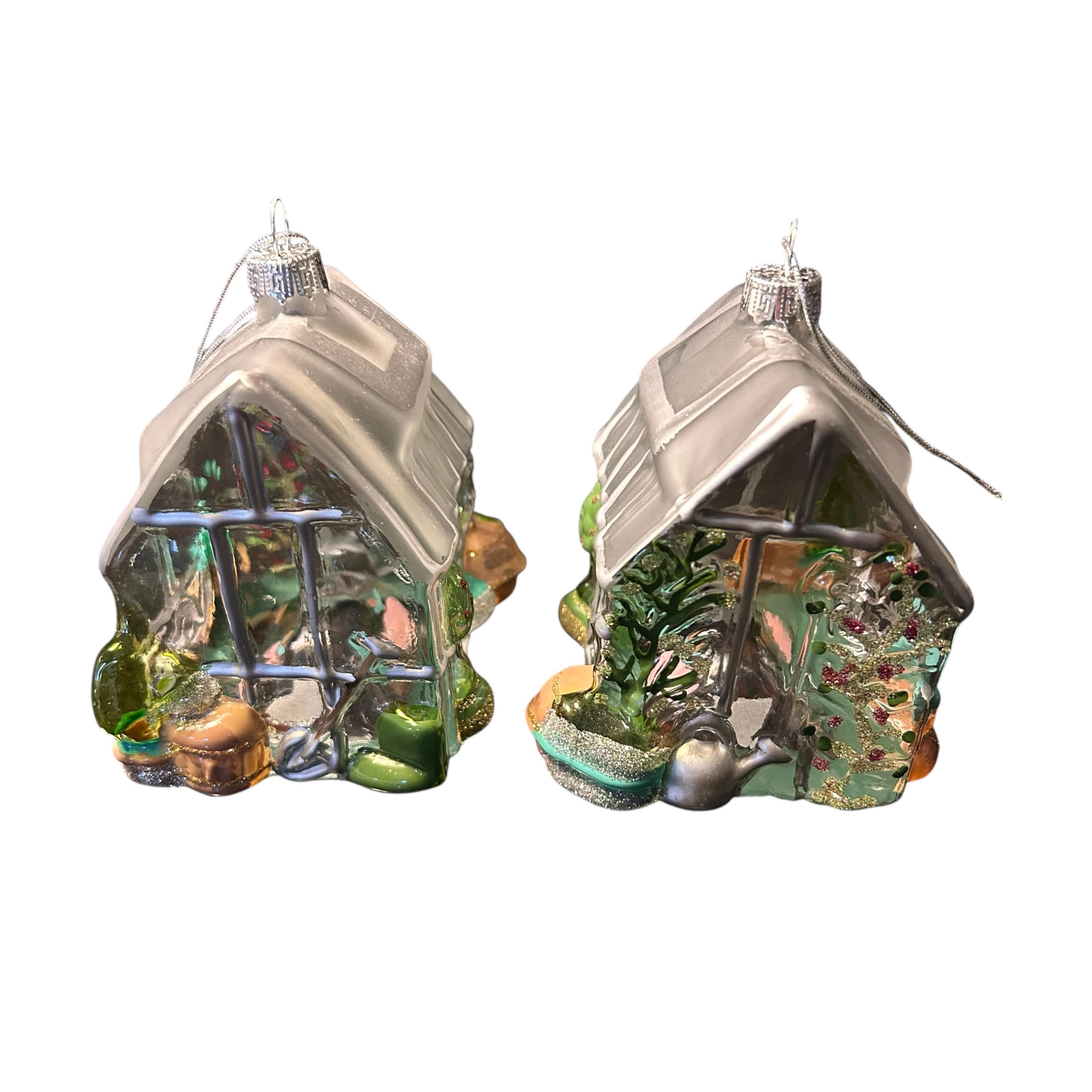 Each piece features intricate glass panels on all four sides, complete with painted details and subtle colour accents that shimmer in the light. The design evokes the charm of a classic greenhouse, making it a thoughtful decoration for gardeners and plant enthusiasts.