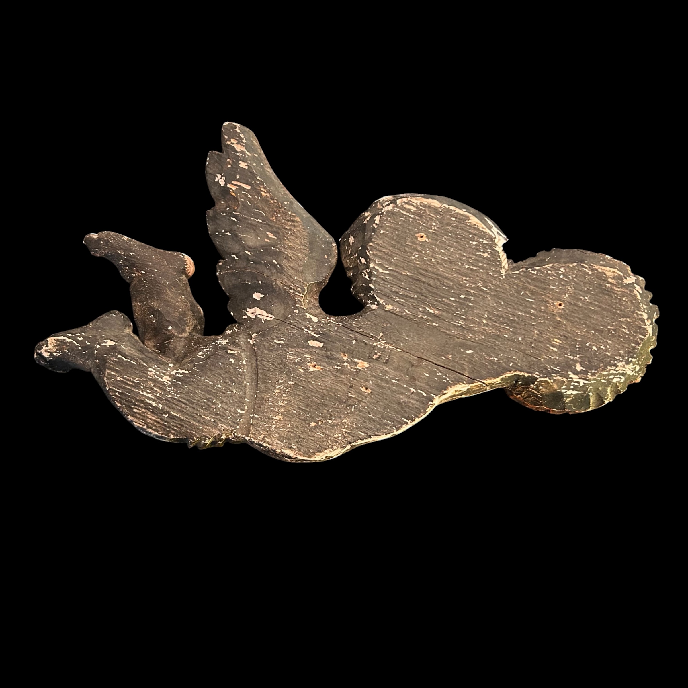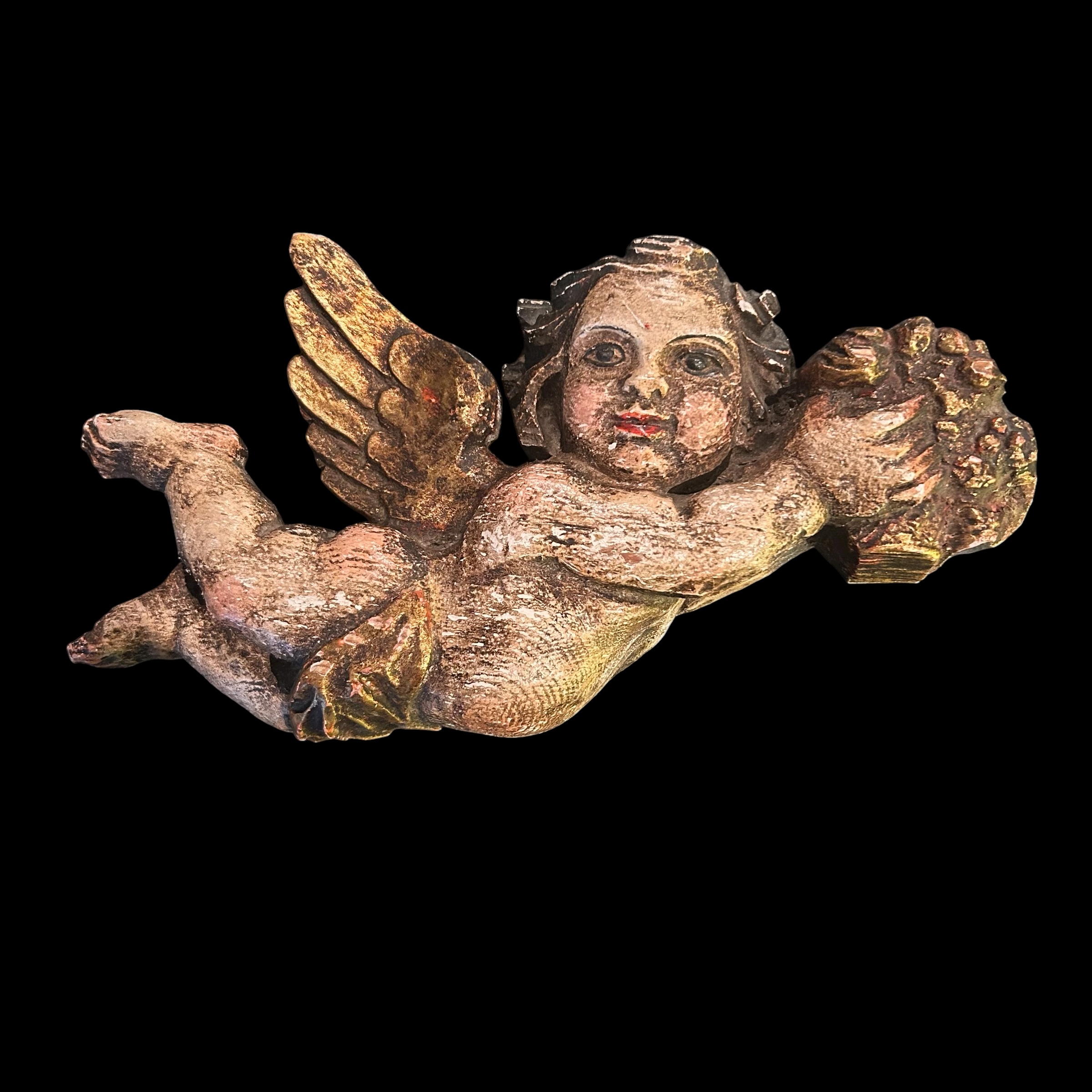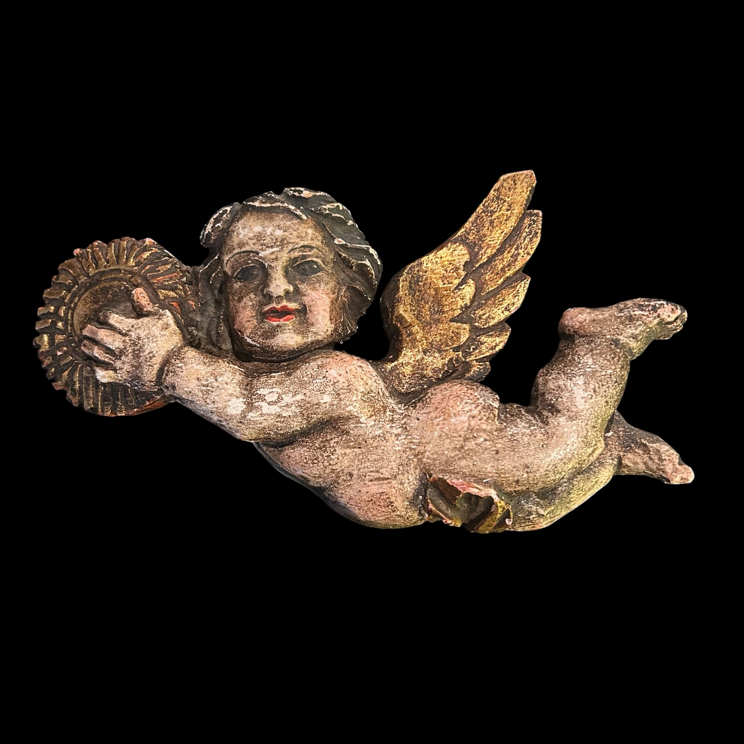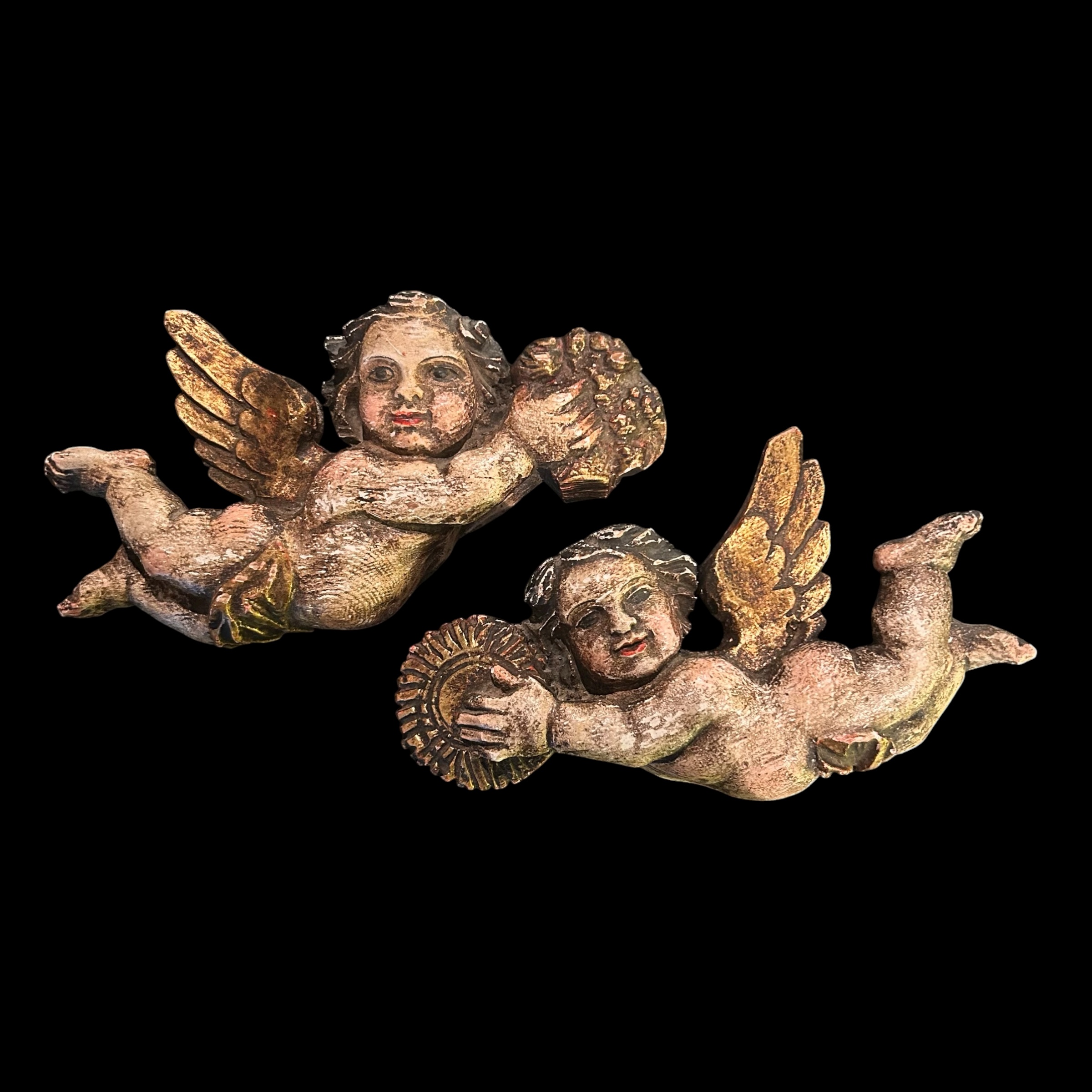 This beautiful pair of vintage carved wooden cherub plaques makes a striking decorative feature for any interior. Each figure is richly detailed and finished in traditional gesso with painted colour and touches of gilt, giving them a warm, softly aged appearance. Although their exact origin and age cannot be confirmed, the style and craftsmanship strongly suggest continental Europe, likely France.