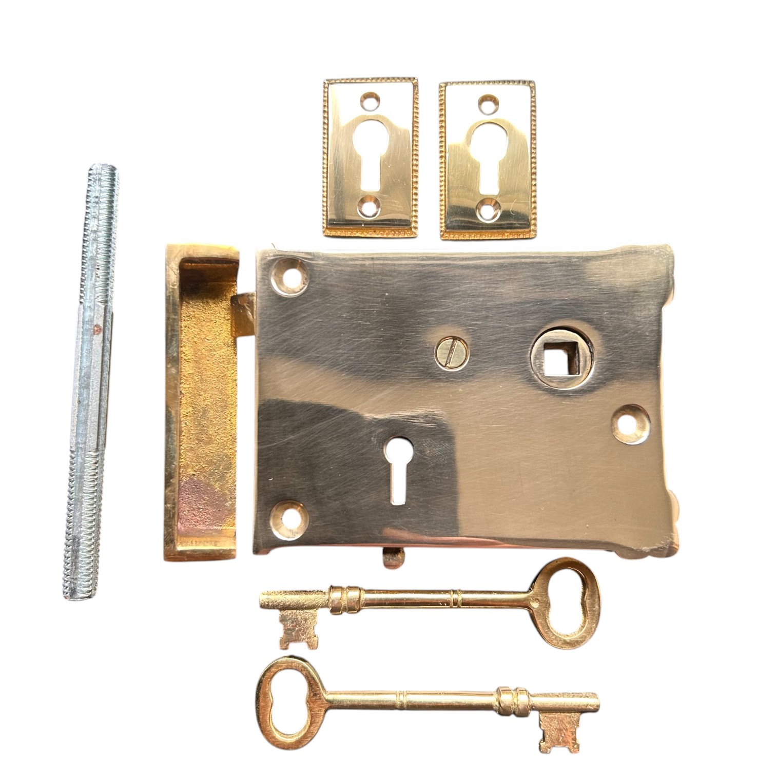 Simple solid brass rim lock with decorative corners complete with keep, screws, spindle, two brass escutcheons and two brass keys. Offers a secure and versatile locking solution for residential and light commercial doors. Measuring 105 x 80 mm, this lock is reversible, allowing for use on both left-hand and right-hand doors, providing flexibility in installation. Ideal to use with most Rim Door Knobs. This rim lock also has an additional separate manual lock mechanism situated at the bottom of the lock.