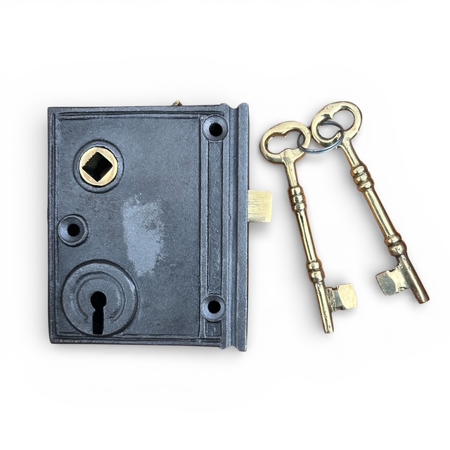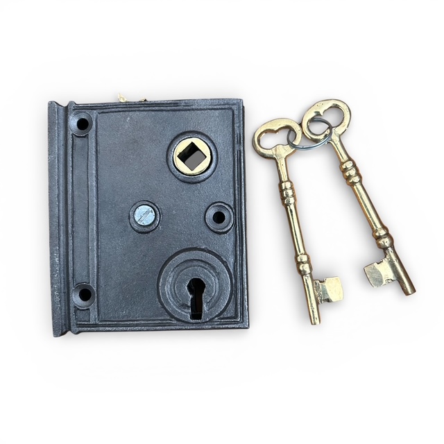 Simple vertical antique iron rim lock complete with keep, screws and two brass keys. Offers a secure and versatile locking solution for residential and light commercial doors. Measuring 90 x 76mm, this lock is reversible, allowing for use on both left-hand and right-hand doors, providing flexibility in installation. Ideal to use with most Rim Door Knobs. This rim lock has a manual locking mechanism situated at the top of the lock.