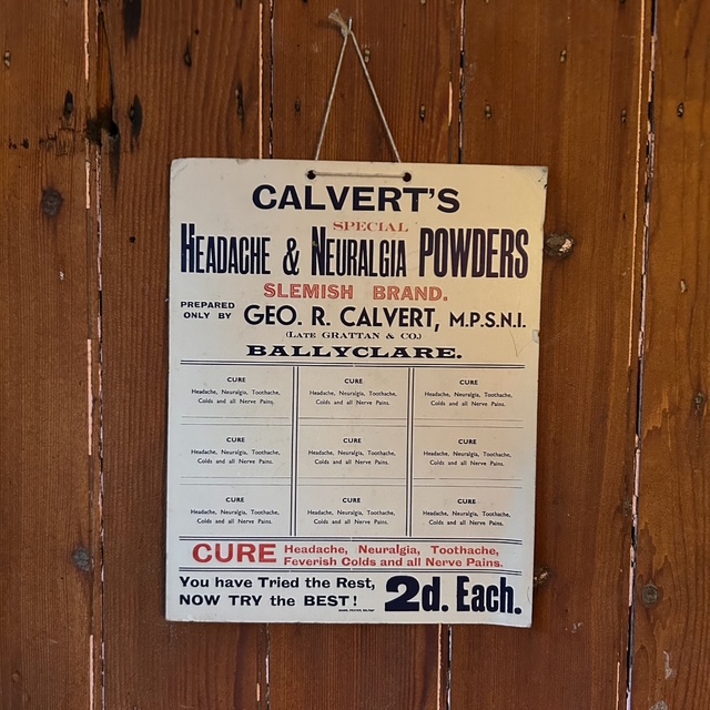 This striking vintage Calvert’s advertising board promotes Calvert’s Special Headache & Neuralgia Powders, also known as the Slemish Brand. Printed in bold blue, red, and black lettering, it showcases classic early 20th-century typography and medicinal marketing language. The board features the name Geo. R. Calvert, M.P.S.N.I., of Ballyclare, adding strong local historical interest for collectors of apothecary or pharmaceutical ephemera.